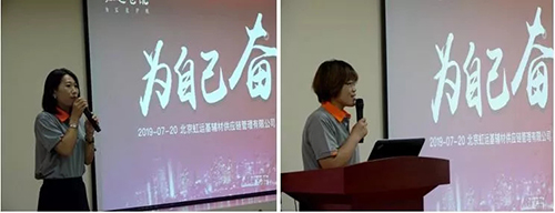 员工代表郝小红女士、耿俊芳女士相继讲话,她们体现,愿充分验展主人翁意识,从我做起、忘我拼搏,不扬弃、不放弃,坚定不移与虹运配合生长。