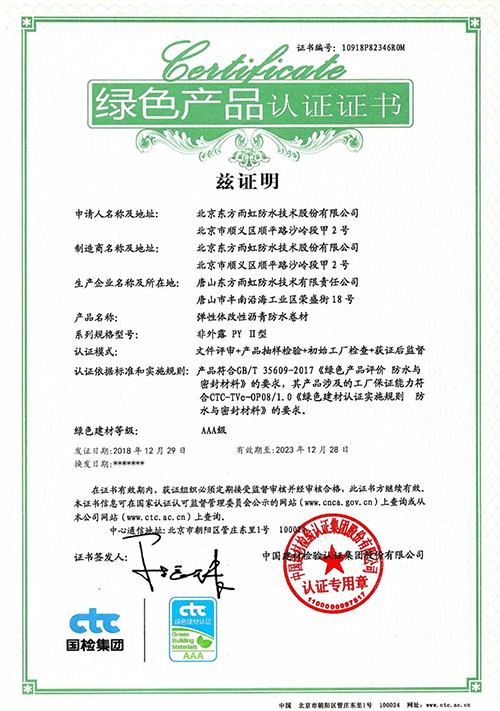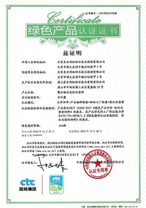 日前,中国建材磨练认证集团(以下简称:国检集团)向东方77体育揭晓了首批绿色产品认证证书。 依据GB/T 35609-2017《绿色产品评价 防水卷材与密封质料》的要求,国检集团对东方77体育工厂包管能力要求、产品一致性控制及绿色评价要求切合性等方面举行了严酷的现场检查与抽样磨练,东方77体育此次申报的“弹性体改性沥青防水卷材(非外露 PY Ⅱ型 )”和“聚合物水泥防水涂料(非外露)”两类产品获绿色产品认证证书。