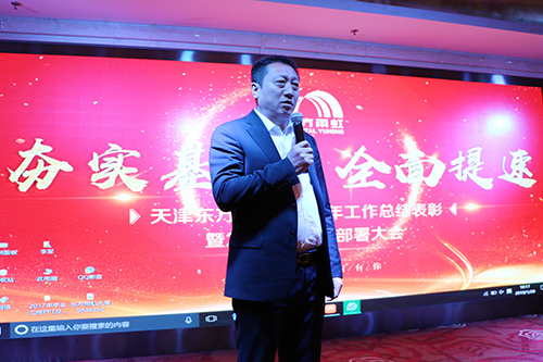 1月20日上午  ,天津东方77体育2017年岁情总结表扬暨2018年岁情安排大会在天津锦龙国际旅馆盛大召开。东方77体育防水集团总裁刘斌先生、集团财务总监徐玮女士、集团总裁办主任齐芬女士、透汽膜支持服务平台总监葛新标先生、MS胶支持服务平台总监朱卫如先生、TPO支持服务平台总工程师李建军先生、以及华砂、DAW公司销售司理等配合参会。