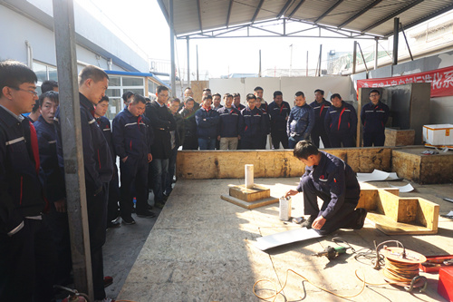 下昼,《单程防水卷材屋面工程手艺规程》及《TPO事业部施工流程梳理及质料管理》的宣贯,让与会职员明确掌握了工程手艺及施工历程中的规章制度,项目司理组和工人代表组也就项目管理的履历与施工手艺作了分享,新同事们如获至宝,现场提问、讨论同步举行。 颁奖环节,现场为TPO事业部优异项目司理王海东、崔岩,优异施工班组张广志,优异施工员李冰,优异新人钟鱼,优异施工队长高明坤等人揭晓奖励及证书。 本次培训还组织TPO细部节点实操大赛,由2015中国屋面防水巨匠徐龙潇现场演示阴阳角和管根的标准化施工实操及解说。TPO事业部的所有施工管理职员及班组组长全神贯注寓目,字斟句酌的施工工法引来阵阵赞叹。