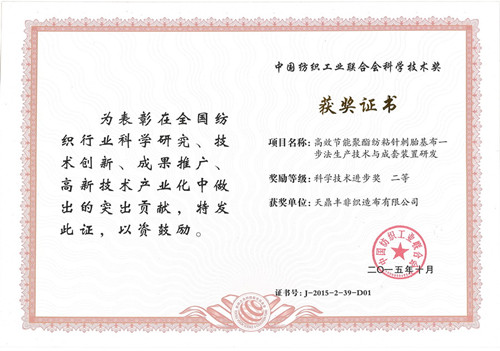 ¡¡¡¡11ÔÂ24ÈÕ£¬¡°·ÄÖ¯Ö®¹â¡±2015Äê¶ÈÖйú·ÄÖ¯¹¤ÒµÍŽá»á¿Æ¼¼½ÌÓý½±Àø´ó»áÔÚ±±¾©ÈËÃñ´óÀñÌÃÊ¢´ó¾ÙÐС£»áÉÏÌ춦·á·ÇÖ¯Ôì²¼ÓÐÏÞ¹«Ë¾µÄ¡¶¸ßЧ½ÚÄܾÛõ¥·ÄÕ³Õë´ÌÌ¥»ù²¼Ò»²½·¨Éú²úÊÖÒÕÓë³ÉÌ××°ÖÃÑз¢¡·ÏîÄ¿ÈÙ»ñ¡°·ÄÖ¯Ö®¹â¡±2015ÄêÖйú·ÄÖ¯¹¤ÒµÍŽá»á¿Æ¼¼ÊÖÒÕǰ½ø½±¶þµÈ½±¡£